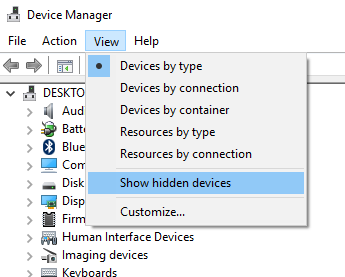 Now go to Views tab and click on Show hidden devices from the drop-down menu.