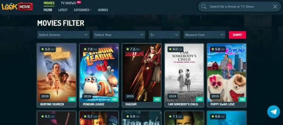 LookMoive offer you an attractive design with the slider of the latest movies; Its homepage is very clear and user-friendly. You get some details of the movie after clicking on its thumbnail, i.e. Release Year, Rating, Genre, and Duration; Movies are in the HD and LQ quality.