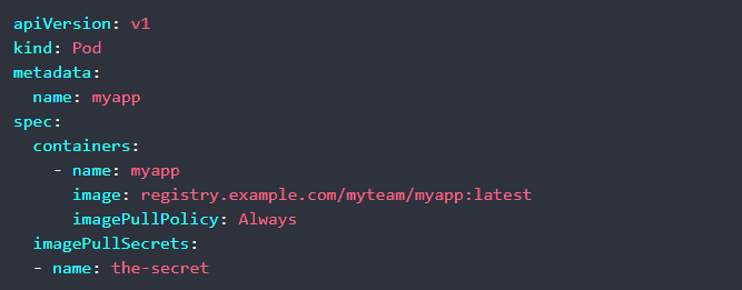 You’ll also have to configure the imagePullSecrets field on your pod. The field tells Kubernetes which specific secret it should use when authenticating to the registry.