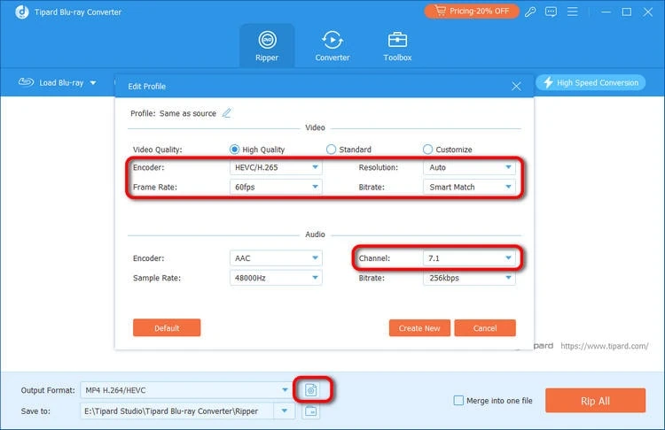 Generally, Blu-ray ripping software offers detailed video and audio adjustments. You can click the Output Format Settings button in this program to open a panel. It should allow you to change the video’s encoder, resolution, and frame rate. The channel setting for the audio is quite vital before you rip the Blu-ray disc. After all, you don’t want to watch a movie with a single audio channel.