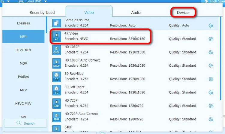 Now, you can select the desired video format for your Blu-ray video. This program focuses on video conversion, so it offers many video formats. It allows you to convert Blu-ray to digital easily. Just pick any video format according to your need. When you click the Device button, you can choose a format that matches a specific device.