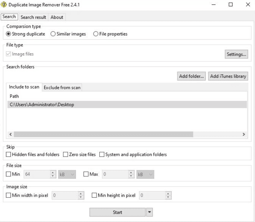 If you want to remove duplicate photos on Windows 10 without spending a penny, the Duplicate Image Remover Free by ManyProg is a 100% free duplicate photo finder for Windows 10. It can also do a good job of deleting duplicate images. To find duplicate pictures on your computer, go for the “Strong Duplicate” option.