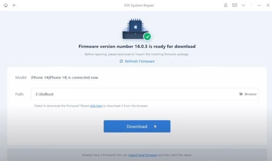 Now ReiBoot will download the firmware for your iPhone 14. Select the download path and click Download. It will take some time, so wait patiently.